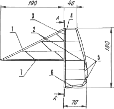 1 — передняя кромка (бальза 10x8); 2 — нервюры (бальза s 1,5); 3 — вертикальная рейка (бальза s 5); 4 — верхняя кромка (бальза 8x8); 5 — задняя кромка (бальза 10x8); 6 — нижняя кромка (бальза 16x5); 7 — основание (бальза s3)