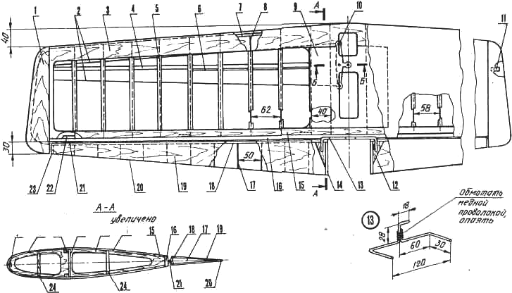 1 — çàêîíöîâêà (áàëüçà); 2 — òðîñèêè óïðàâëåíèÿ (êîðäîâàÿ íèòü o0,3x4); 3 —ëîáèê (áàëüçà s2); 4— ïîëêà ëîíæåðîíà (ñîñíà, ó êîðíÿ 7x5, íà êîíöå— 7x3); 5 — íàêëàäêà íåðâþðû (áàëüçà s2); 6— ñòåíêà ëîíæåðîíà (áàëüçà s2, òîëüêî äî ñåðåäèíû êîíñîëè êðûëà ñ îêíàìè îáëåã÷åíèÿ ìåæäó íåðâþðàìè); 7 — íîñîê (ñîñíà 4x4); 8 — íåðâþðà êðûëà (áàëüçà s2,3); 9 — çàøèâêà öåíòðîïëàíà (áàëüçà s2); 10 — êà÷àëêà (äþðàëþìèíèé s3); 11 —ãðóç (ìàññà 20 ã); 12 — êîñûíêà (áàëüçà s10); 13 — êàáàí÷èê çàêðûëêîâ ñ êîðîìûñëîì (ïðîâîëîêà ÎÂÑ o2,5); 14,23 — êîíöåâûå íåðâþðû çàêðûëêà (áàëüçà s2,5); 15 —çàøèâêà çàäíåé êðîìêè êðûëà (áàëüçà s2); 16 — çàäíÿÿ êðîìêà êðûëà (áàëüçà 18x6); 17 — íåðâþðà çàêðûëêà (áàëüçà s1,5); 18 — ïåðåäíÿÿ êðîìêà çàêðûëêà (áàëüçà 10x6); 19 — çàøèâêà çàêðûëêà (áàëüçà s 1,2); 20 — çàäíÿÿ êðîìêà çàêðûëêà (îêàíòîâêà — ëèïîâûé øïîí s1); 21 —ïåòëÿ íàâåñêè çàêðûëêà (3 øò.); 22 — óñèëåíèå ïîä ïåòëþ íàâåñêè çàêðûëêà (áàëüçà 30x10x5); 24 — ïîïåðå÷íûå ðåéêè (áàëüçà 2,3x2,3); 25 — ïåòëÿ òðîñèêà óïðàâëåíèÿ (ïðîâîëîêà ÎÂÑ o1,5); 26— îñü êà÷àëêè (ïðîâîëîêà ÎÂÑ o3); 27 — âòóëêà ñ ôëàíöåì (äþðàëþìèíèé); 28 — áðóñîê (áóê 7x6)